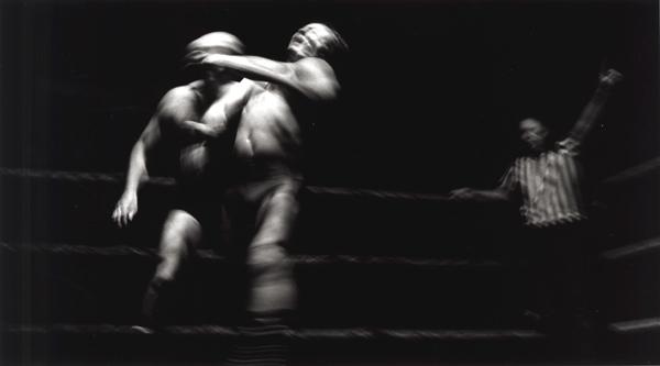 Moment de tension et d'agressivité, le combat qui se déroule prend la forme d'une chorégraphie primitive, un ensemble de figures et de prises liées entre elles pour traduire l'affrontement. A partir du point de netteté, la déflagration se poursuit: zones bougées et déformées. Le geste stylisé des lutteurs trouve alors son écho sur la surface sensible.